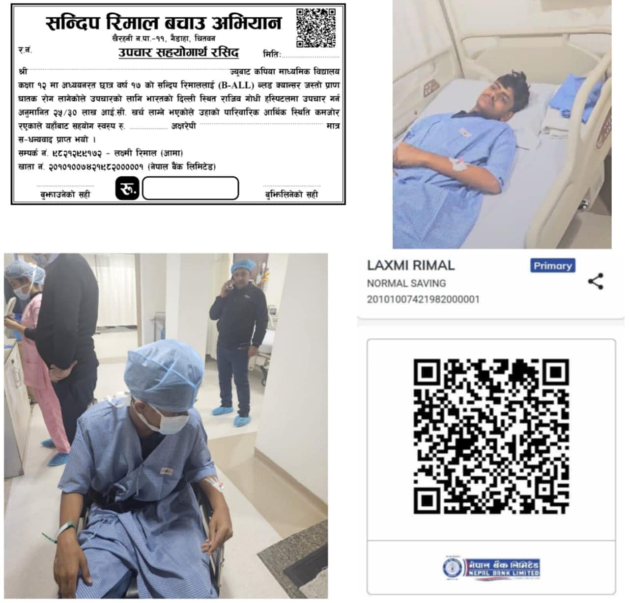 अस्पतालमा क्यान्सर रोगसंग लडी रहेको छ । मृत्यु र जीवन वरणको दोसाँधमा क्यानसरसंग लडी रहेका उनी निकै कमजोर आर्थिक अवस्थाका छन् । सन्दिप रिमाललाई ब्लड क्यानसर भएको अस्पताल श्रोतले उनका परिवारलाई जानकारी दिईएको छ । रिमाल परिवार चितवनको खैरेनी नगरपालिकामा बस्दै आएको निकै लामो समय भयो । उनका परिवारले चितवनको खैरेनीमा अरूको जमिन कमाएर खेती पाती गर्ने र ज्याला मजदुरी गरी दैनिकी चलाउँदै आएका थिए । सन्दीप अहिले चितवनकै कपिया माध्यामीक विद्यालयमा कक्षा १२मा अध्ययनरत विद्यार्थी हुन् । बुवा आमाले गरेको ज्याला मजदुरीबाट उनको उपचार अव सम्भव नभएको भन्दै संन्दिपले आफू बाँच्ने रहर भएको तर आर्थिक अभावका कारण उपचारमा समस्या भएको भन्दै थप सहयोगका लागी रिमाल परिवारले आग्रह समेत गरेका छन् ।ब्लड क्यानसरको उपचारमा सबै सम्पती सकियो अब के गर्ने उपचार खर्च कसरी जुटाउने उनको परिवारमा चिन्ता थपिएको छ ।